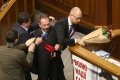 Piektdien Ukrainas parlamentā izcēlies kautiņš starp premjera Arsēnija Jaceņuka Tautas fronti un prezidenta partijas Petro Porošenko bloka deputātiem.