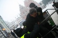 Lai pievērstu uzmanību bezdarba problēmām Latvijā, "telšu pilsētiņas" pirmais iemītnieks Gints Gaiķēns bija plānojis ar pacēlāju tikt līdz Rīgas domes vicemēra Aināra Šlesera darba kabineta logiem un izkarināt savu prasību plakātu. Policija protestētāju aizturēja tiklīdz kā viņš bija iekāpis pacēlāja grozā. Kā norādīja valsts policijas pārstāvji, Gints Gaiķēns savu akciju nebija saskaņojis ar Rīgas domes instancēm, tādēļ aicināja protestētāju pārtraukt plānotās darbības. Savukārt G.Gaiķēns, norādot uz vārda brīvību un to, ka netraucē satiksmi, atteicās pildīt policijas prasības. Kad ar grūtībām policijas darbiniekiem izdevās protestētāju izvilkt no pacēlāja groza, viņš tika aizturēts par nepakļaušanos policijai. Lasīt visu rakstu... Publicēts 13. janvārī, 2010. Autors: Latvijas Nacionālais biznesa portāls Bizness.lv.