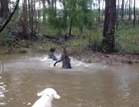 Austrālijā nofilmēts neparasts atgadījums – dīķī iedzīts ķengurs centies noslīcināt suni, kas zvēru aprējis. Kad kļuvis jau pavisam traki, suņa saimnieks beidzis filmēt un devies savu mīluli glābt.
